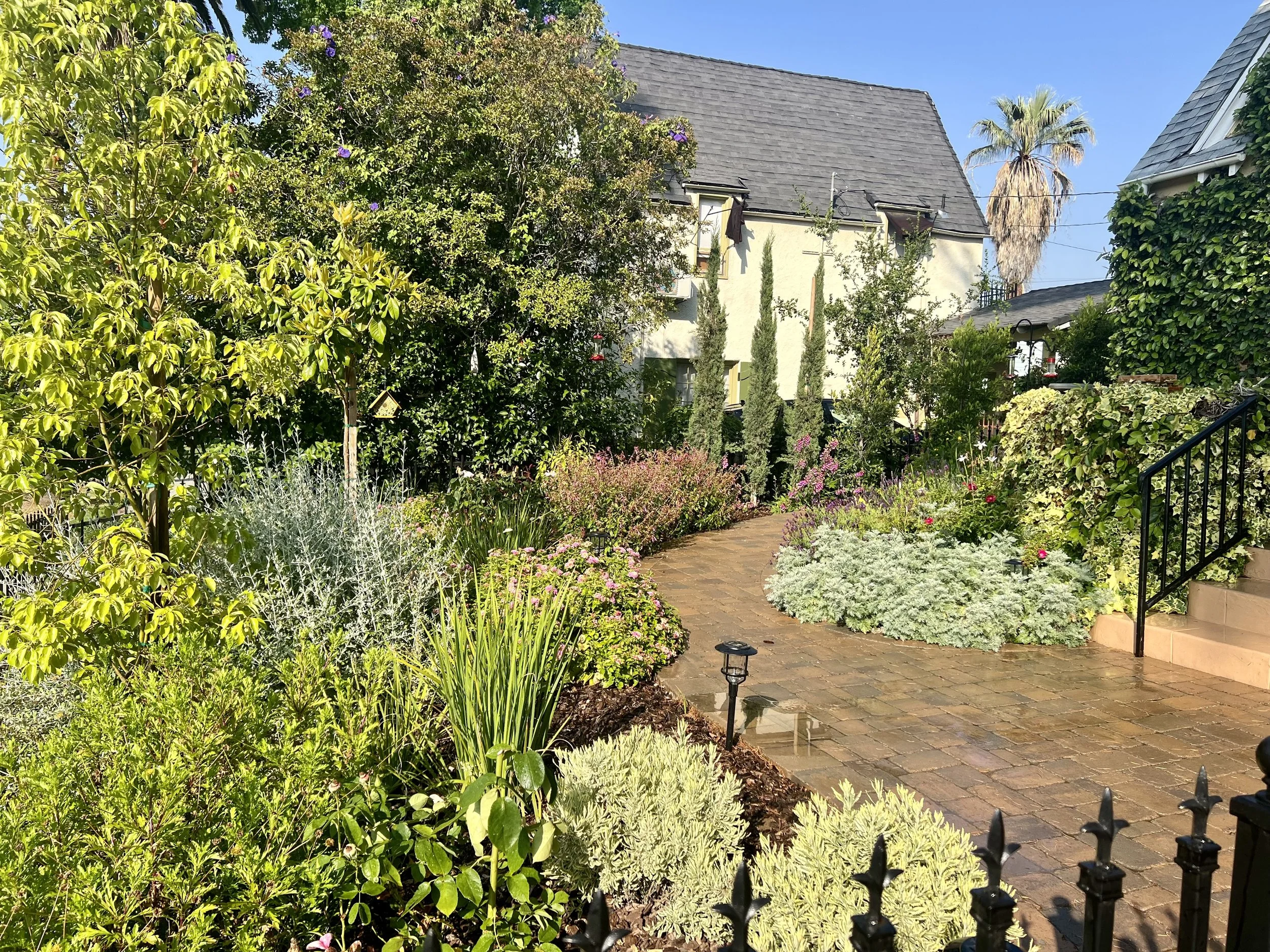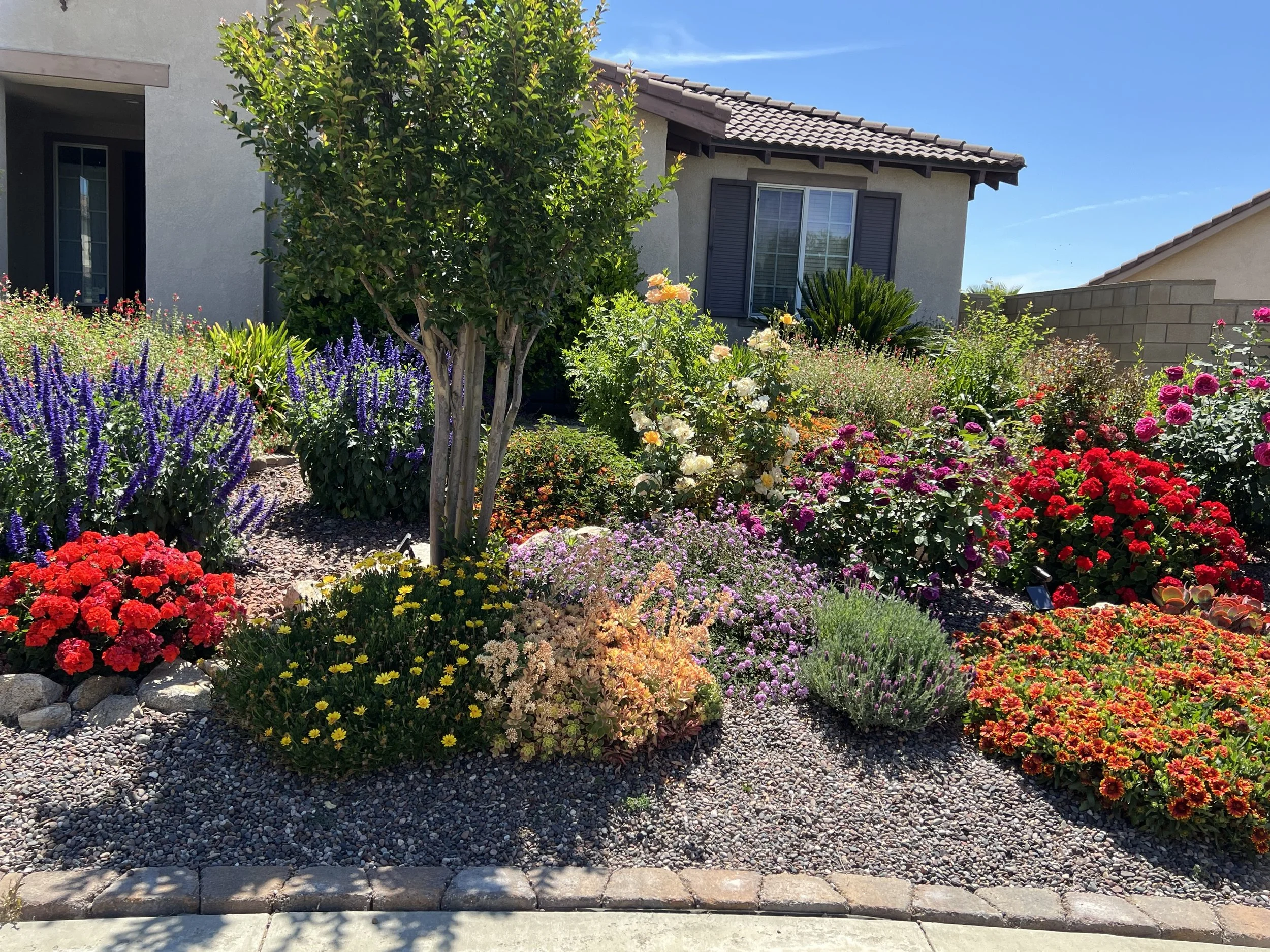 Located in Winchester, the Wethers house shows the diversity of colorful water-wise flowers in landscape with roses, lantana, lavender, succulents, and various native plants and flowers. The Wethers landscape was planted in 2022 and was designed and installed by the homeowner.